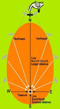 一旦您按此步骤进行,您可以将区域范围缩小至等于或小于20英尺。然后您就可以使用普通金属探测器来完成工作了。一些对本产品的使用相当精通的人几乎能精确定位目标点至脚下。要达到这种程度,建议您勤加练习。(如下图)
